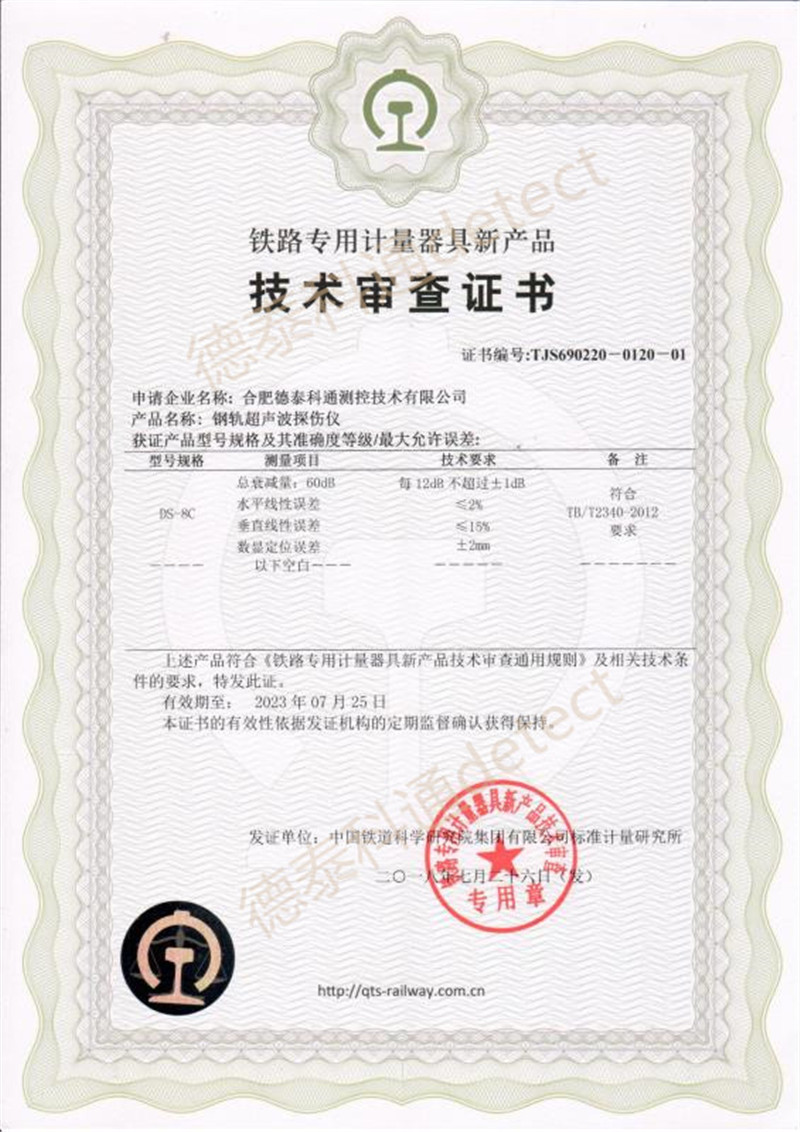 7月下旬我司项目团队前往北京参加评审会议,在会议上,我司项目负责人向铁科院的领导及专家组阐述了钢轨探伤仪的性能特征、工作原理等,专家组认真听取了相关的报告且审阅了钢轨探伤仪相关资料,最终一致认定我司产品均达到行业各项指标,并对产品中一些创新性的技术给予了高度肯定,并颁发证书。